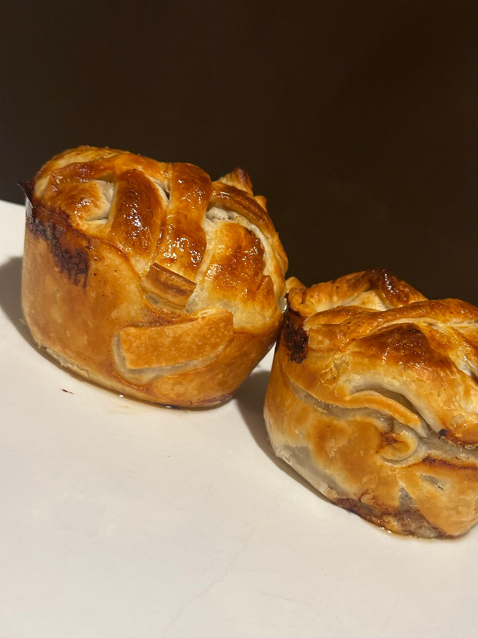 9. Bring the edges of the pastry together to enclose the filling, pinching to seal. For extra security, you can add a small cross of pastry over the top.